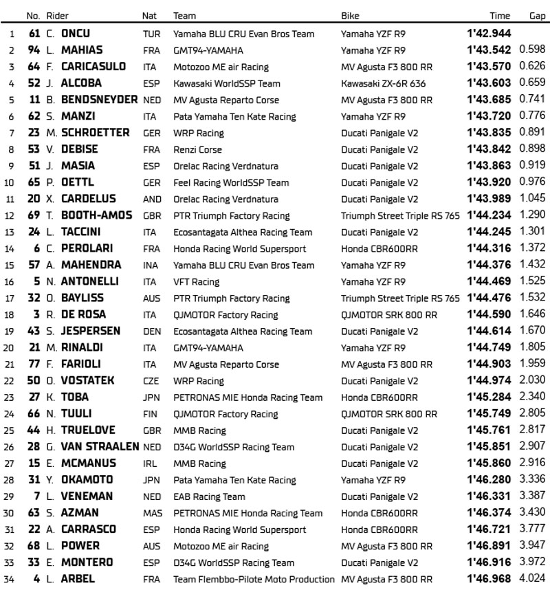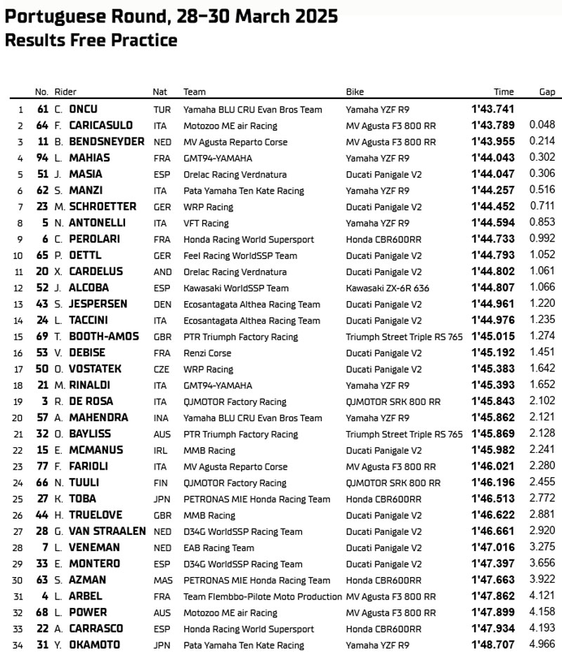 Le matin, la FP1 au Portugal avait déjà donné un avant-goût de la journée, Can Öncü affichant le meilleur temps en 1’43.741 devant les deux MV Agusta F3 800 RR de Federico Caricasulo (Motozoo ME air Racing) et Bo Bendsneyder (MV Agusta Reparto Corse), suivi, déjà de Lucas Mahias.