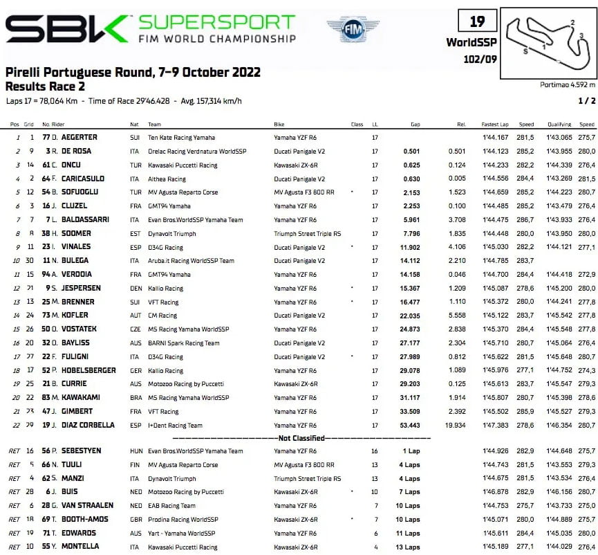 Résultats de la Course 2 des WorldSBK Supersport à Portimão :