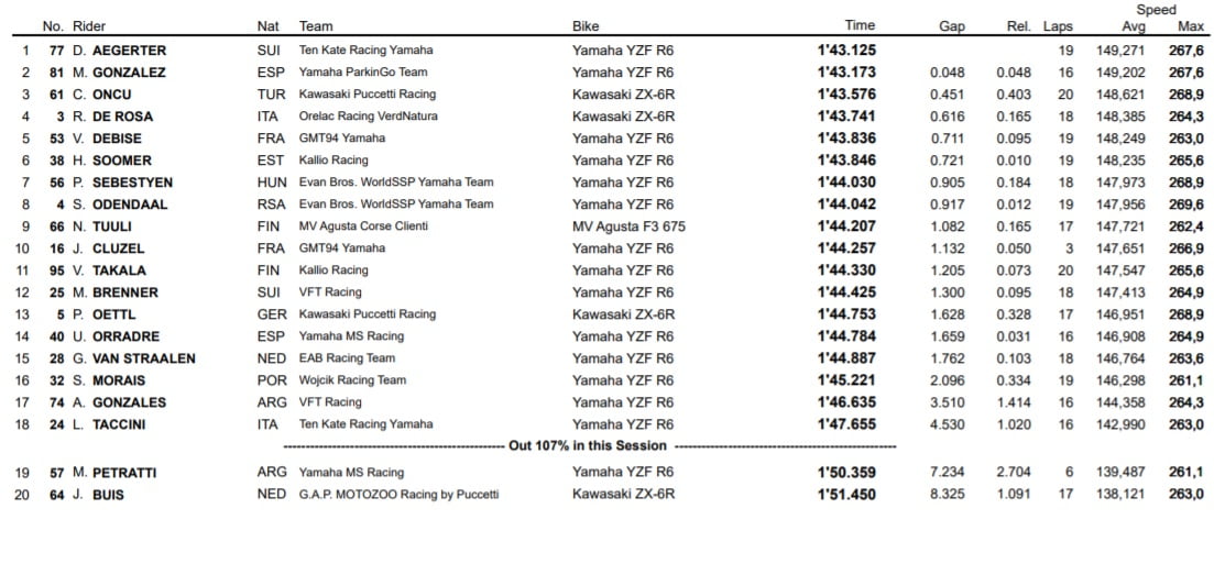 La première place est finalement revenue à Aegerter, qui lance ainsi brillamment son weekend, devant Manuel González. L’Espagnol occupe la troisième place du championnat devant Philipp Öttl (17 points séparent les deux hommes) depuis la dernière manche disputée au Portugal, et a bien l’intention de boucler la saison 2021 sur le podium final.