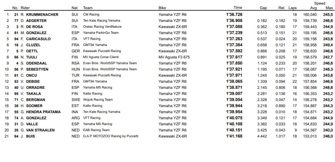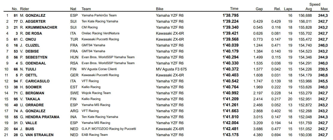 Le Suisse devance ainsi son compatriote Aegerter, auteur d’une belle progression à la deuxième place, alors que Raffaele de Rosa termine quant à lui en troisième position. Il faut ensuite descendre au quatrième rang pour trouver Manuel Gonzalez, devant Federico Caricasulo et le Français Jules Cluzel.