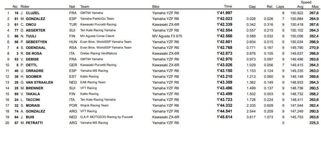Le pilote du GMT94 devance Manuel González et Can Öncü, qui l’avaient déjà accompagné hier sur le podium de la première course. Le leader du championnat Dominique Aegerter occupe quant à lui la quatrième place, devant Niki Tuuli et Peter Sebestyen, alors qu’il faut descendre au septième rang pour retrouver le seul pilote encore en mesure mathématiquement de lui contester le titre cette année, Steven Odendaal.