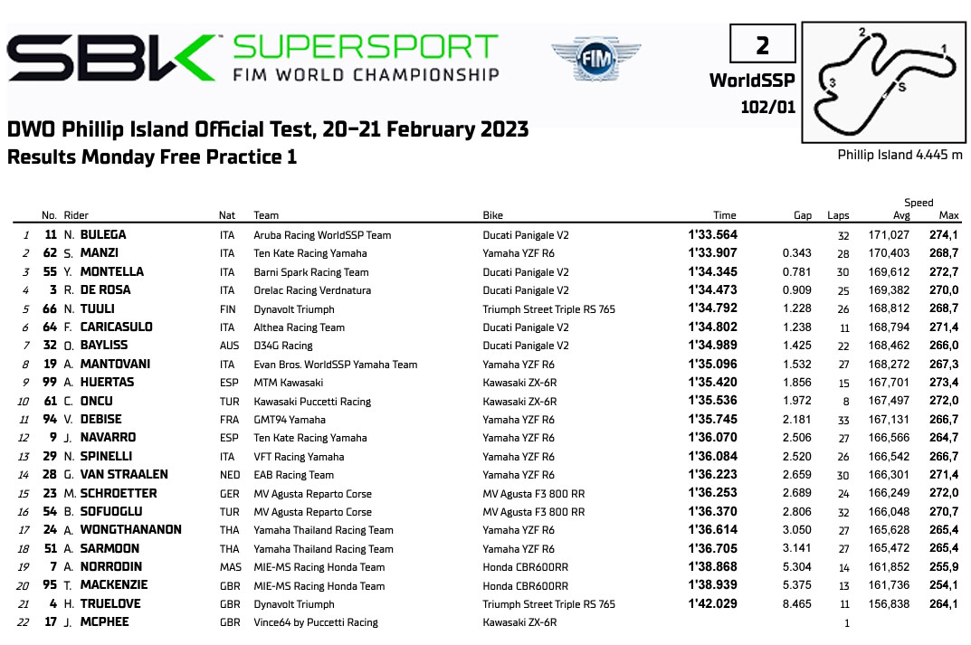 Résultats WSBK Supersport Test Phillip Island J1 FP1 :