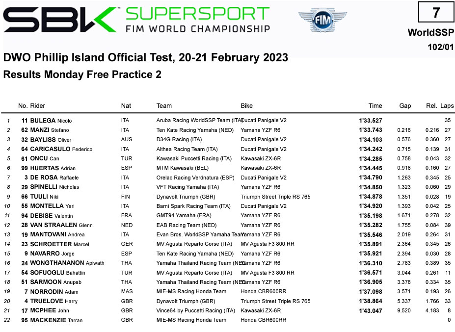 Au terme des 32 tours effectués avec un meilleur chrono en 1’33.564, soit près d’une demi-seconde plus rapide que le meilleur tour en course réalisé en 2022, Nicolò Bulega s’est ménagé une avance de 3 dixièmes sur Stefano Manzi (Ten Kate Racing Yamaha), meilleur et esseulé représentant de la firme d’Iwata. En effet, derrière, on compte pas moins de quatre Ducati et une Triumph avant de retrouver une autre R6, en l’occurrence celle de Andrea Mantovani (Evan Bros. WorldSSP Yamaha Team), à savoir  les Panigale V2 de Yari Montella (Barni Spark Racing Team) et Raffaele De Rosa (Orelac Racing VerdNatura), la Street Triple RS de Niki Tuuli (Dynavolt Triumph), ainsi que les autres Ducati de Federico Caricasulo (Althea Racing Team) et Oli Bayliss (D34G Racing).