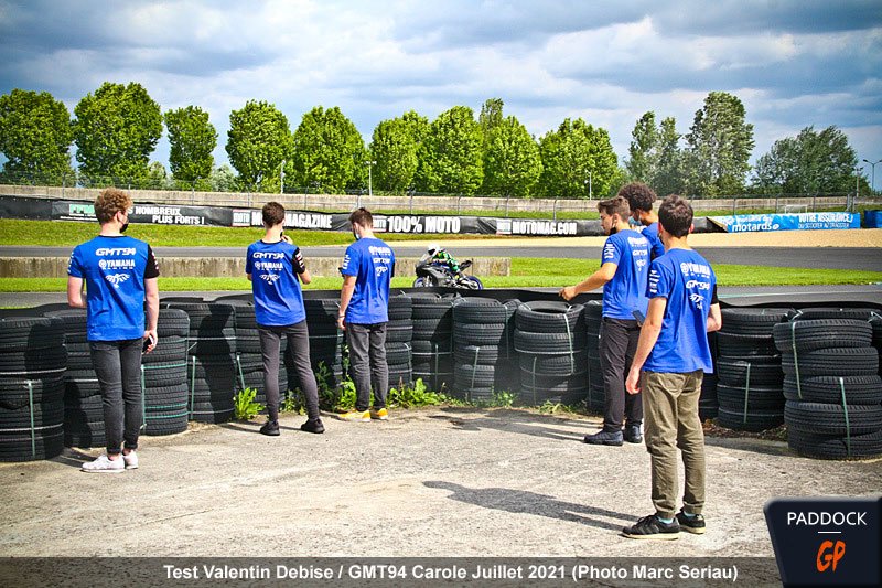 Jeudi dernier, c’est donc vers 16 heures que nous arrivons sur le circuit parisien et découvrons que, malgré la présence des motards d’Île-de-France en train de tourner sur le tracé de 2 kilomètres, le programme du GMT94 est plutôt chargé, partagé entre l’adaptation de la Yamaha R6 à Valentin Debise, l’essai de ladite machine par Bertrand Gold pour GP Racing (numéro de septembre), le tournage d’une vidéo par le « youtubeur » Carbone23, et le rodage de plaquettes de freins et de disque pour le team en Mondial, le tout au milieu d’une multitude de jeunes habillés aux couleurs du GMT94, que Christophe Guyot nous explique être des stagiaires en fin de stage.