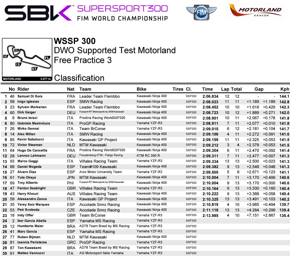 Ce matin, des conditions plutôt frisquettes ont vu Toprak Razgatlioğlu (Pata Yamaha with Brixx WorldSBK) s’imposer avec un meilleur tour provisoire en 1’50.783 devant Jonathan Rea (Kawasaki Racing Team WorldSBK) à une demi-seconde et Álvaro Bautista (Aruba.it Racing – Ducati) à plus de 7/10, alors que plusieurs pilotes restaient dans leur box en attendant que la piste se réchauffe.
