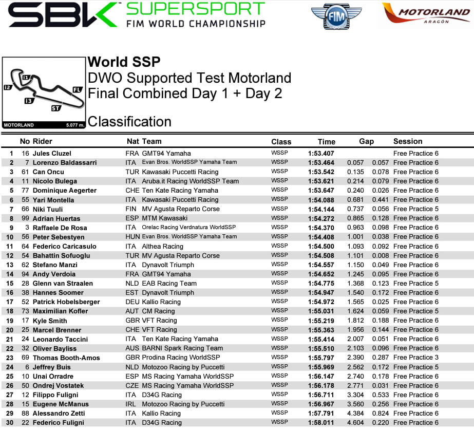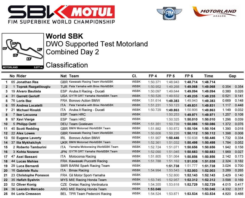 Le chrono de 1’48.943 établi lors de la deuxième séance du mardi était suffisant pour s’assurer de terminer en tête, mais le Britannique a quand même amélioré l’après-midi avec un tour en 1’48.714, terminant de dernier test Superbike .3 dixièmes devant l’incontournable Toprak Razgatlioğlu.