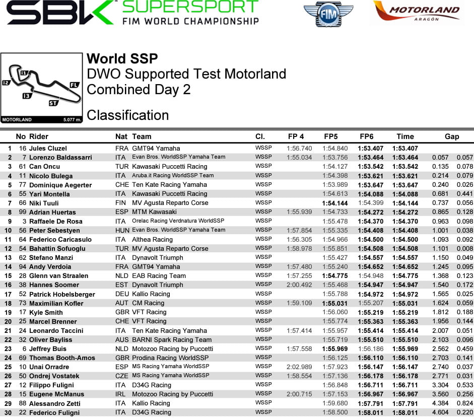 Jules Cluzel (GMT94 Yamaha) termine en tête de ces essais, juste 57 millièmes devant Lorenzo Baldassarri (Evan Bros. WorldSSP Yamaha Team), 0.135s devant Can Öncü (Kawasaki Puccetti Racing) et deux dixièmes devant Nicolo Bulega (Aruba.it Racing WorldSSP Team) et Dominique Aegerter (Ten Kate Racing Yamaha).