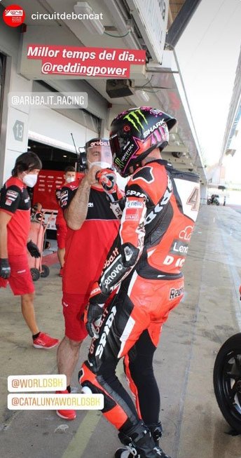 Au terme de la première journée de ces deux jours de test sur le circuit de Catalunya–Barcelona, l’électron libre et néanmoins pilote officiel Ducati, Scott Redding, aurait toutes les raisons de se laisser aller à une certaine exubérance, comme il le fait souvent dans ses vidéos diffusées sur Instagram : il a en effet réalisé un travail plus que solide, avec deux longs runs sur une piste à 46°, et obtenu en prime le meilleur temps de la journée, malgré une attaque de dernière minute du champion du monde en titre Jonathan Rea.