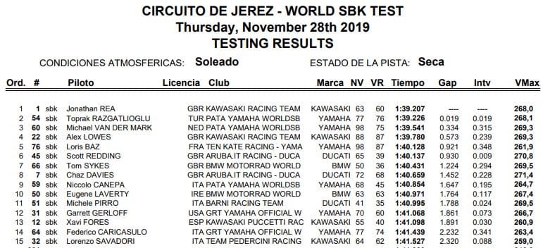 En Supersport, certains teams étaient absents car dans l’expectative. Le règlement technique pour 2020 ne leur avait pas été communiqué et ils ne pouvaient donc pas fabriquer les moteurs. « Il est donc inutile qu’on vienne à Jerez » a expliqué Christophe Guyot, du GMT94 Yamaha, qui a ajouté « nous roulerons les 22 et 23 janvier à Jerez, puis les 26 et 27 janvier à Portimão ».