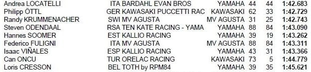 Andrea Locatelli prenait l’avantage en fin de matinée en 1’42.685, améliorant déjà le meilleur temps établi la veille par Randy Krummenacher (MV Agusta Reparto Corse) en 1’43.150.