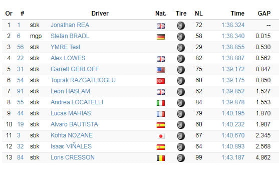 Derrière, si l’on excepte Stefan Bradl décidément très occupé en ce moment, on trouve Toprak Razgatlioglu qui a testé les R1 2020 et 2021. C’est au guidon de cette dernière, également utilisée par Garrett Gerloff, que le pilote turc a réalisé son meilleur chrono, à une demi-seconde de Jonathan Rea.