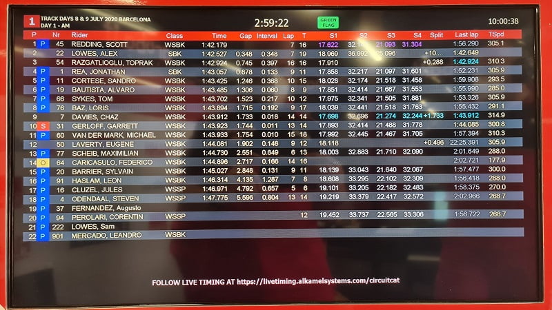 Lors de la deuxième heure de roulage, Scott Redding améliorait sa meilleure performance en 1’41.985, devant Johnny Rea en 1’42.017, soit avec un écart de seulement 0.03 entre la Ducati et la Kawasaki. L’autre ZX-10RR, pilotée par Alex Lowes, figurait en troisième position à 0.5 de Redding, précédant les deux Yamaha de Toprak Razgatlioglu et de Michael van der Mark, à 0.9 de la Panigale V4 R du leader.