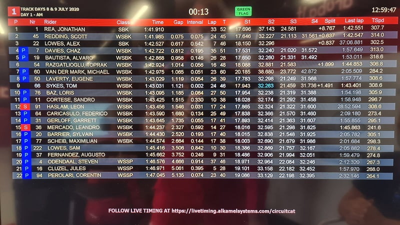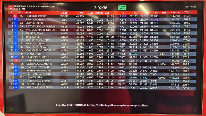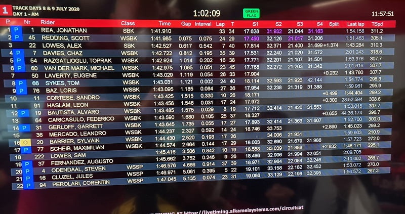 A 11h30, Johnny Rea accélérait son rythme et s’emparait de la première place en 1’41.910, avec 0.075 d’avance sur son compatriote Scott Redding. Alex Lowes était troisième en 1’42.527, devant Chaz Davies à 0.8, puis deux groupes très compacts : on trouvait à 1.0 Razgatlioglu et van der Mark, puis à 1.1 Laverty, Sykes et Baz. Les Honda d’Haslam et Bautista pointaient aux onzième et douzième positions, alors que Sylvain Barrier était seizième.