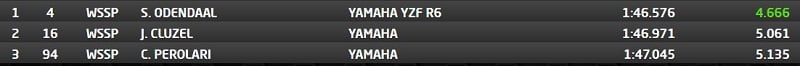 La première heure était favorable à Jules Cluzel qui dominait les Supersport en 1’46.971, avant que Steven Odendaal ne prenne l’avantage lors du deuxième tour de cadran en 1’46.866.