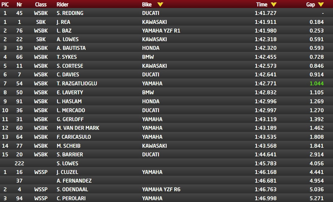 Dans un premier temps, Scott Redding réalise un 1’42.133, environ 2 dixièmes devant un trio composé de Lowes, Baz (meilleur pilote Yamaha) et Rea, reléguant le reste des prétendants à au moins une demie-seconde.