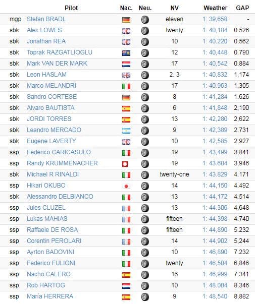 La matinée était nettement dominée par les deux coéquipiers du Bardahl Evan Bros Racing Team Federico Caricasulo et Randy Krummenacher, devant les deux Kawasaki Puccetti d’Hikari Okubo (16e) et Lucas Mahias (19e) qui encadraient Jules Cluzel (18e).