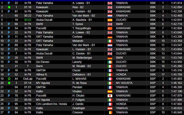 A l’heure du déjeuner, Alex Lowes tournait en 1’42.584, soit un peu moins vite que le 1’42.195 de Rea établi la veille. Puis Lowes améliorait en 1’41.814, suivi par Rea en 1’42.094, Haslam en 1’42.256, Van der Mark en 1’42.488 Bautista en 1’42.631 et Sykes en 1’42.718.