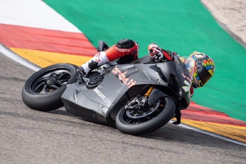 Du côté de l’équipe Aruba.it Racing – Ducati, la nouvelle recrue pour 2019 Alvaro Bautista brillait par son absence, accaparé en cette fin de semaine par son dernier Grand Prix en MotoGP chez Aspar (Angel Nieto team). Chaz Davies était donc le seul pilote officiel Ducati au MotorLand Aragon pour essayer la Panigale V4R de 998 cm3 dont la réduction de la cylindrée est obtenue en conservant l’alésage de 81 mm, alors que la course a été réduite à 48,4 mm grâce à un nouveau vilebrequin en acier forgé qui repose sur des demi-lunes faisant office de roulements et qui conserve la disposition décalée à 70° des manetons. Ce V4 est équipé d’un boîtier électronique basé sur l’utilisation de la plate-forme inertielle 6 axes de Bosch (6D IMU – Inertial Measurement Unit). Chaz Davies était épaulé en Aragon ce mercredi par Michael Ruben Rinaldi, engagé sous les couleurs du Barni Racing. Davies bouclait un total de 61 tours et Rinaldi 74.
