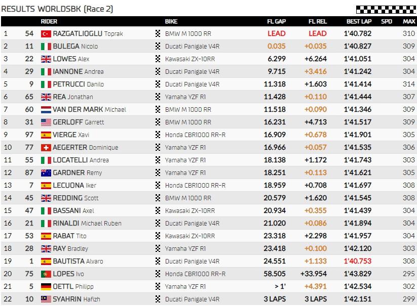 La course Superpole de 10 tours a vu Razgatlioglu s’élancer depuis la pole position. Bien que rétrogradé en troisième position après le premier tour, il n’a pas tardé à reprendre les commandes. Au virage 1 du deuxième tour, il a dépassé Alex Lowes (Kawasaki Racing Team WorldSBK) et Danilo Petrucci (Barni Spark Racing Team), creusant immédiatement l’écart pour s’assurer la victoire. Cette performance lui a permis de battre le précédent record de 11 victoires consécutives, détenu par Jonathan Rea et Alvaro Bautista.