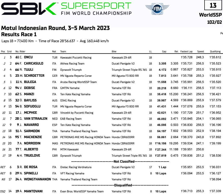 Sous le drapeau à damier mais aussi sous un soleil reprenant possession du ciel, Öncü triomphe pour Kawasaki devant Caricasulo, Tuuli, et Schroetter qui devance le leader du championnat Bulega. Quatre constructeurs différents sint aux quatre premières places. Manzi est septième et Debise bon sixième en Indonésie.