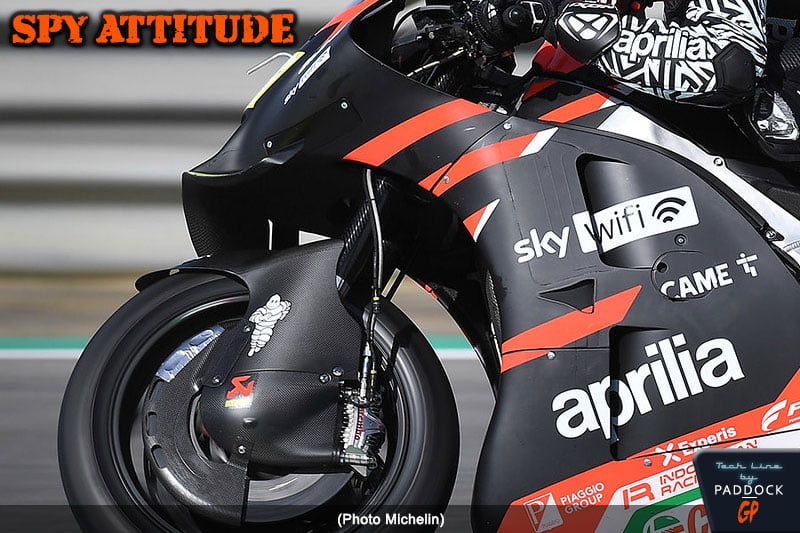 Enfin, chez les autres constructeurs, seul Aprilia semble travailler avec soin sur son garde-boue avant, ce dernier englobant intégralement les tubes de fourche (mais pas les fourreaux), et ayant déjà connu plusieurs évolutions.