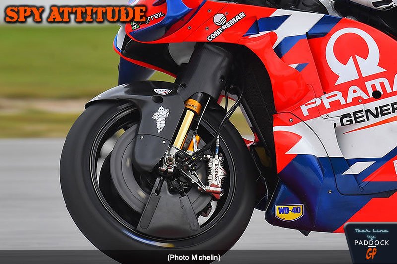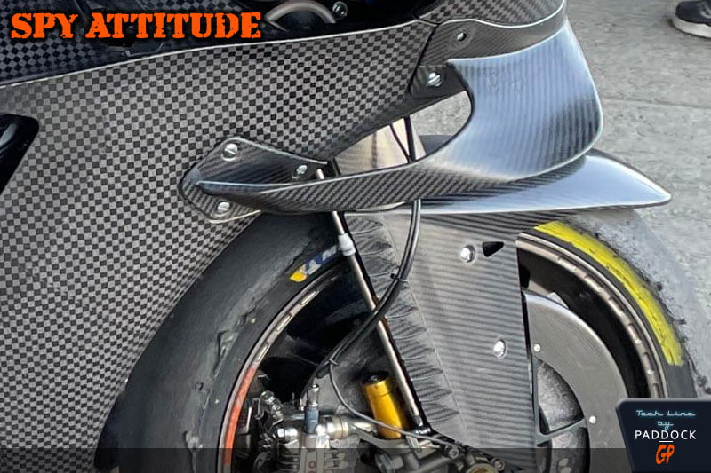 A cet égard, et avec les divers systèmes de ride height device, l’aérodynamique joue un rôle de plus en plus important et est étudiée avec attention par les hommes d’Iwata. Ils ont ainsi déposé en septembre de l’année dernière une demande de brevet international concernant le carénage des fourreaux et des tubes de fourche, alors que Ducati n’avait caréné précédemment que les fourreaux de ses Desmosedici. Celui-ci a été validé en mars 2022.