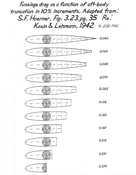 Pour préserver le « confort de conduite », on utilise donc une forme tronquée à l’arrière, traditionnellement dénommée Kamm Tail, K-tail ou KVF, du nom de l’aérodynamicien allemand Wunibald Kamm qui a travaillé sur le sujet dans les années 1930 pour BMW. La partie arrière de la goutte d’eau ou de l’aile d’avion est donc tronquée brutalement, ce qui détériore « un peu » l’écoulement du flux d’air par rapport à une forme aérodynamiquement idéale, mais beaucoup moins que la simple section circulaire d’un tube de fourche. Aujourd’hui, même les fabricants de vélos travaillent encore beaucoup sur le sujet pour leur haut de gamme de compétition.