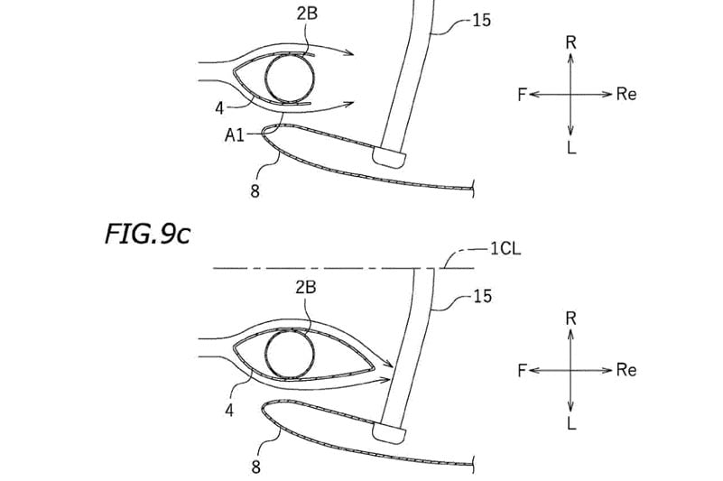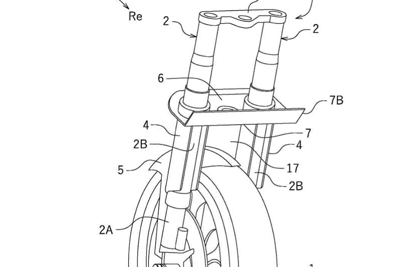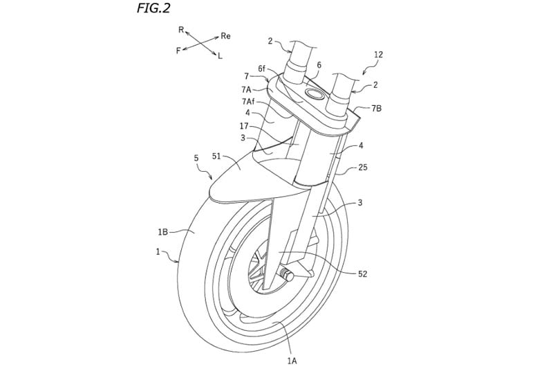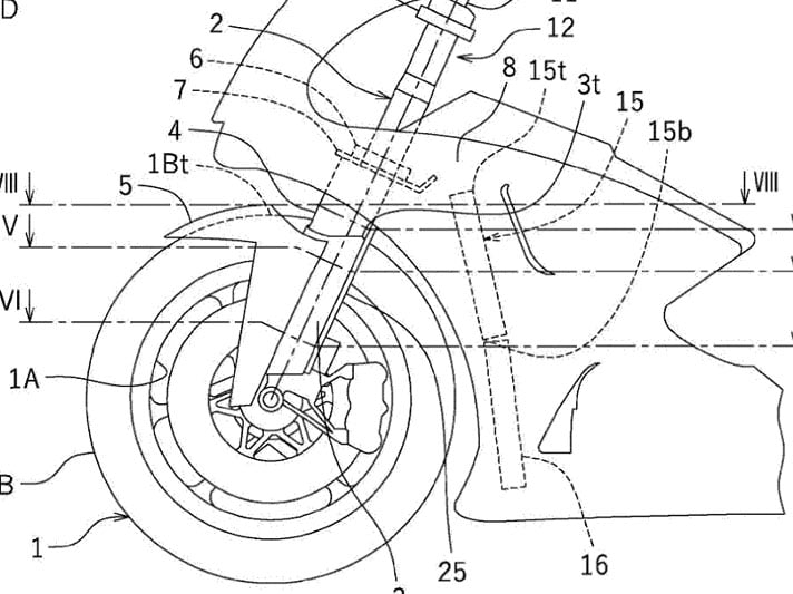 Le langage des brevets est toujours très particulier, et on peut le constater une fois de plus dans la présentation du système : « Une motocyclette comprend un carénage supérieur et un carénage inférieur couvrant la suspension d’une fourche avant. Le carénage supérieur est séparé du carénage inférieur. Une section transversale du carénage supérieur et du carénage inférieur, perpendiculaire à une ligne axiale de la suspension, est définie par une forme obtenue en coupant une partie arrière d’une forme aérodynamique. »