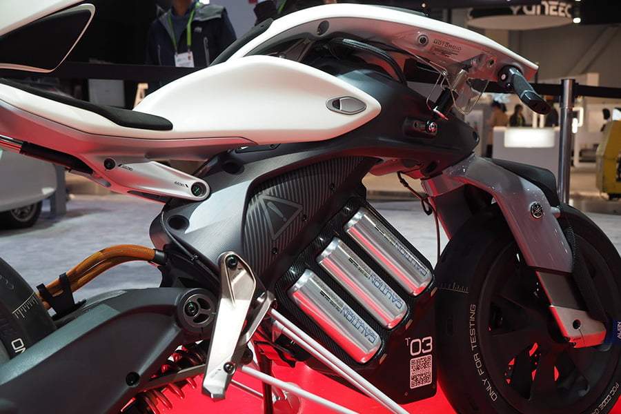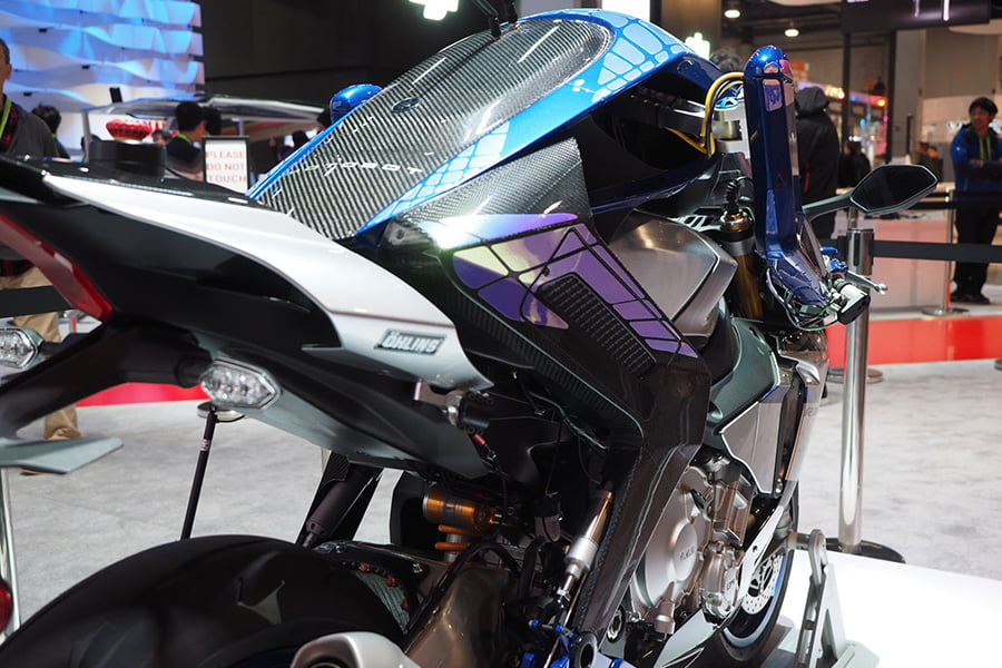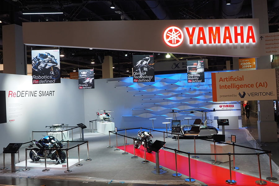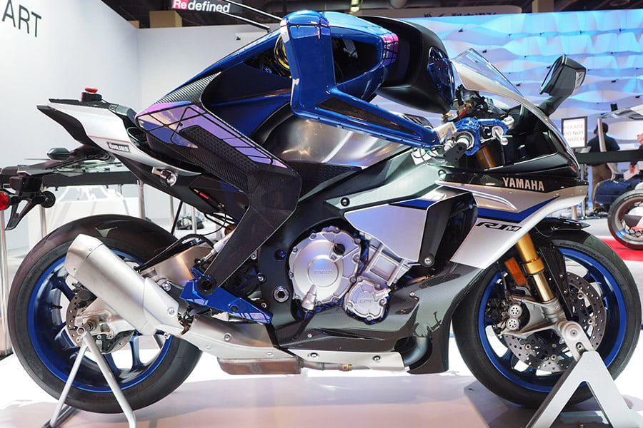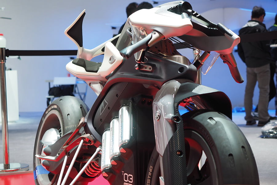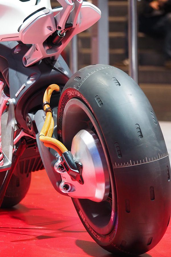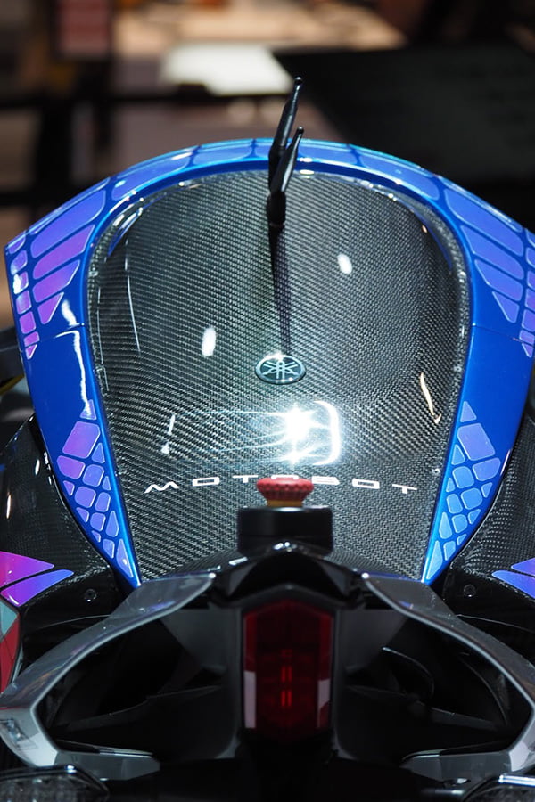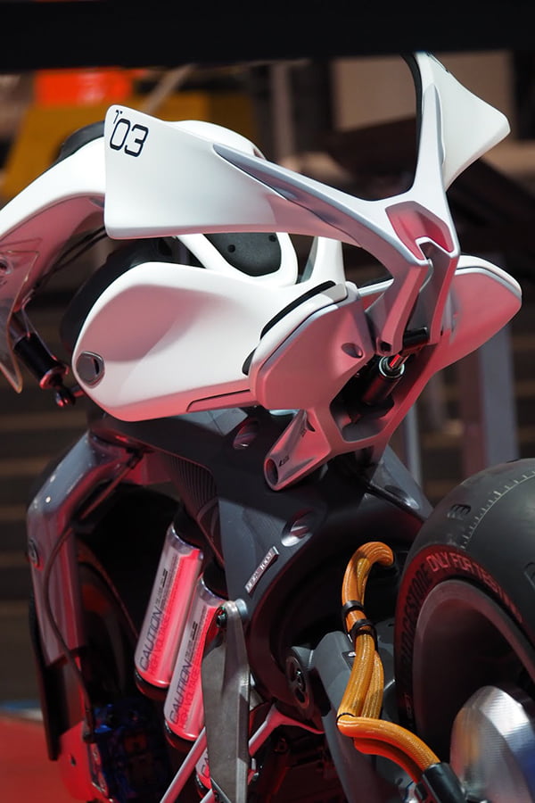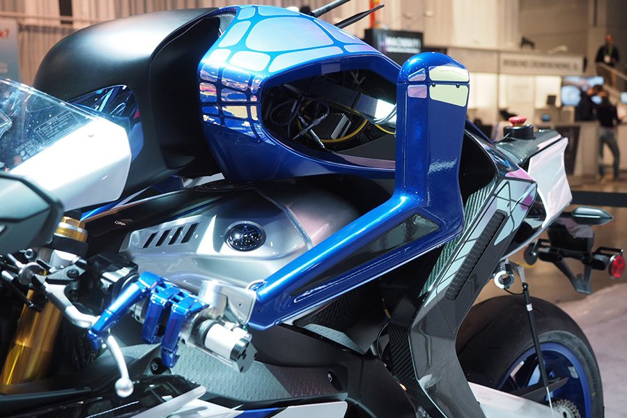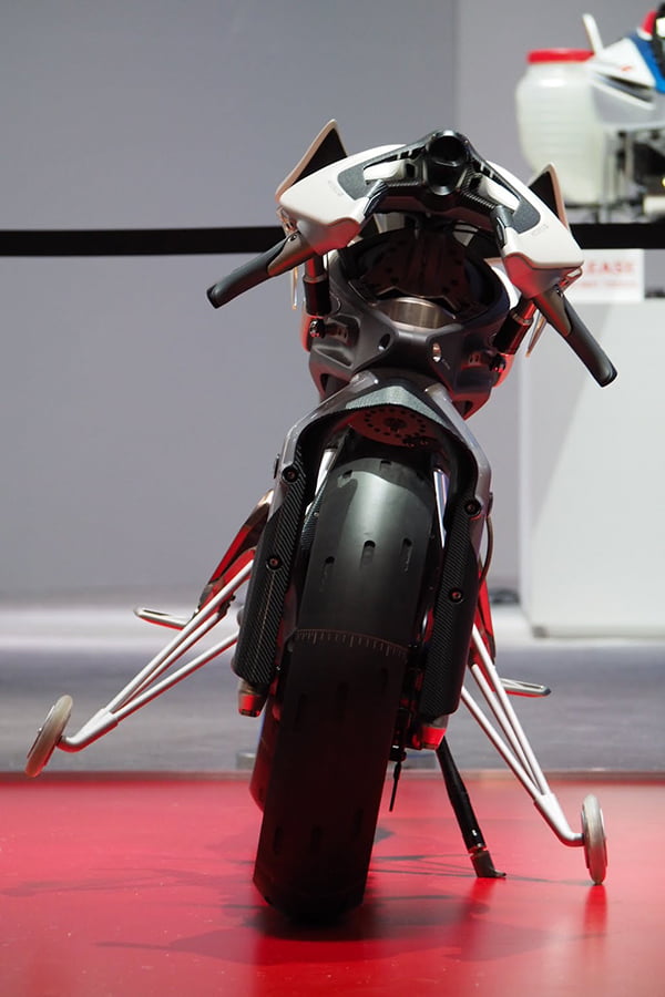 Motobot était exposé aux côtés de Motoroid, la moto sans pilote dotée d’une intelligence artificielle qui la rend incapable de tomber, déjà présentée à Tokyo par la firme d’Iwata.