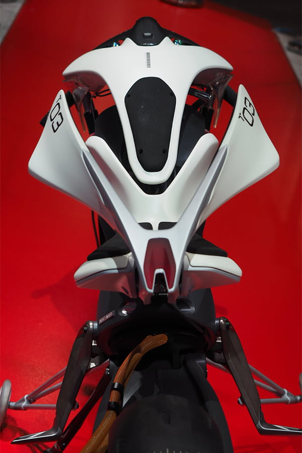 Elle est de plus dotée de petites ailettes installées sur l’arrière de la selle, qui viennent doucement enserrer le bassin du pilote lorsque la vitesse augmente afin de mieux lui garantir une bonne position et le rassurer psychologiquement.